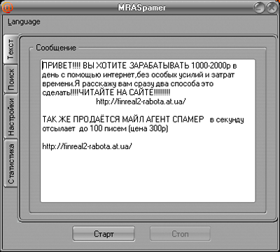 Троянская программа для рассылки текстовых сообщений пользователям Интернет – пейджера Mail.ruAgent. Программа является приложением Windows (PE EXE-файл). Имеет размер 421466 байт. Упакована при помощи Upack. Распакованный размер – около 1811 КБ. Написана на Delphi.