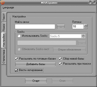 Программа имеет три режима работы: рассылка по собранной базе, рассылка с предварительным поиском, сбор базы через поиск и отправку запроса авторизации. Программа поддерживает сетевой протокол socks5. Возможен запуск сразу в двух режимах, тогда программа сначала разошлет сообщение по собранной базе, а потом через поиск будет собирать новую базу и сразу же рассылать сообщения.