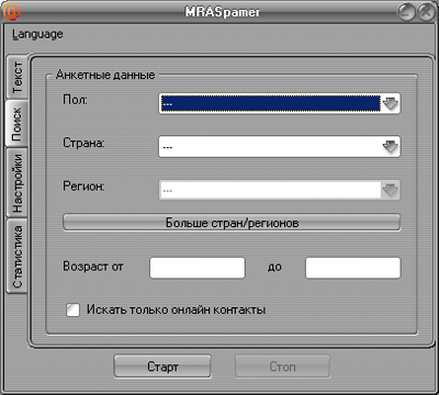 В параметрах поиска можно задать возраст, пол, место нахождения, проверку пользователя на наличие в сети.