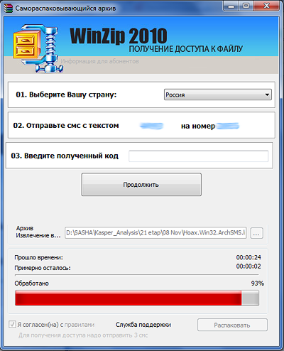 При нажатии на кнопку "Распаковать" отображается окно с требованием отправить смс на некоторый короткий номер для завершения распаковки: