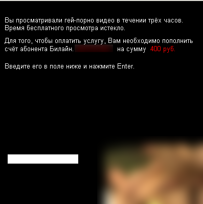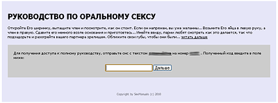 Запущенный вредонос блокирует систему пользователя и вымогает отправить смс на платный номер для получения кода снятия блокировки. При этом вредонос отображает следующее окно: