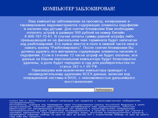Ваш компьютер заблокирован за просмотр, копирование и тиражирование видеоматериалов содержащих элементы педофилии и насилия над детьми. Для снятия блокировки Вам необходимо оплатить штраф в размере 500 рублей на номер Билайн "номер телефона". В случае оплаты суммы равной штрафу либо превышающей ее на фискальном чеке терминала будет напечатан код разблокировки. Его нужно ввести в поле в нижней части окна и нажать кнопку "Разблокировать". После снятия блокировки Вы должны удалить все материалы содержащие элементы насилия и педофилии. Если в течение 12 часов штраф не будет оплачен, все данные на Вашем персональном компьютере будут безвозвратно удалены, а дело будет передано в суд для разбирательства по статье 242 ч.1 УК РФ.