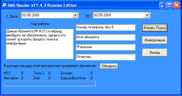 В дальнейшем программа проводит якобы проверку данных и сообщает пользователю, что найдено определенное количество SMS за указанный им период. При этом неважно, указан ли номер действующего абонента, или совершенно случайные ФИО и бессмысленный набор цифр – данная функция является лишь прикрытием, т.к. никакого обмена информацией по внешнему каналу программой не проводится.