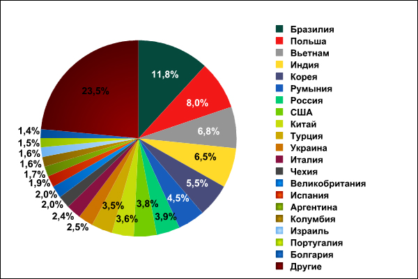 В рейтинге стран — источников спама первое место заняла Бразилия, сгенерировавшая в августе 11,8% от общего количества е-мусора. Далее идут Польша (8%), Вьетнам (6,83%), Индия (6,55%) и Корея (5,52%). Россия — седьмая с 3,9%.