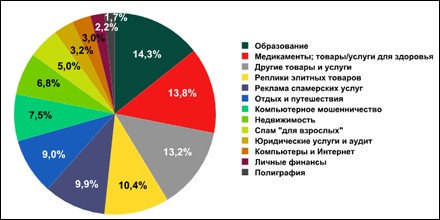 Чаще всего пользователи получали спам с рекламой образовательных услуг, медикаментов и товаров для здоровья, а также дешевых копий элитных товаров. "Лаборатория Касперского" отмечает, что в августе спамеры менее активно рекламировали собственные услуги: доля таких писем сократилась на 5,5%. По мнению экспертов, с наступлением осени уже нет необходимости столь активно продвигать массовые рассылки, как это приходилось делать в разгар кризиса и во время летнего спада деловой активности.