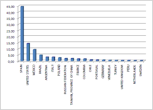 По информации, полученной в течение октября антивирусной лабораторией PandaLabs, Испания возглавила рейтинг по количеству ботов с показателем 44,49% от общего числа компьютеров, зараженных ботами. Эти программы сразу после проникновения в компьютер позволяют хакерам получать удаленный контроль над системой и выполнять ряд действий, включая рассылку спама и загрузку вирусов, червей и троянов и др.