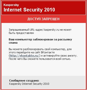 При попытке пользователя зараженного компьютера выйти на любой из этих сайтов (кроме vkontakte.ru), он перенаправляется на сервер, который выводит в браузере следующее сообщение, оформленное в стиле Web-антивируса Лаборатории Касперского: