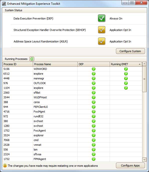 Любые приложения, работающие на Windows XP или выше, могут быть защищены с помощью Data Execution Prevention (DEP), Exception Handler Overwrite Protection (SEHOP) и других технологий, при этом, конечное приложение не обязано поддерживать DEP. Если вы используете устаревшие уязвимые версии программ, EMET позволяет увеличить срок использования этих приложений до выхода новой версии ПО.