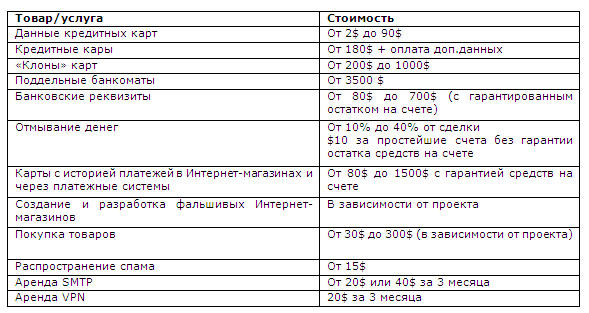 Специалисты PandaLabs обнаружили, что стоимость данных о счетах колеблется от 10$ до 1500$ в зависимости от платформы и гарантии имеющихся средств. Кроме того, кибер-преступники предлагают так называемые клонированные кредитные / дебетовые карты (от 180$), устройства для клонирования карт (200$ - 1000$), и даже поддельные банкоматы (от 3500$ в зависимости от модели). Дополнительные услуги, такие как отмывание денег (посредством банковских переводов или обналичивания чеков) доступны по цене, составляющей от 10 до 40 % работы. Если покупатели хотят использовать похищенные банковские реквизиты, чтобы купить продукты через Интернет, но боятся, что их вычислят через адрес доставки, кибер-преступники могут сделать это за них. Стоимость такой услуги составляет от 30$ до 300$ (в зависимости от выбранного продукта).