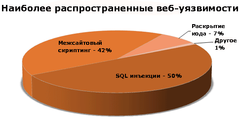 Примерно половина всех обнаруженных уязвимостей была связана с так называемыми SQL инъекциями. Напомним, что SQL инъекция - это один из распространённых способов взлома программ, работающих с базами данных. Атака типа инъекции SQL может быть возможна из-за некорректной обработки входящих данных, используемых в SQL-запросах. Инъекция SQL часто даёт возможность атакующему выполнить произвольный запрос к базе данных, например, прочитать содержимое любых таблиц или удалить все данные.