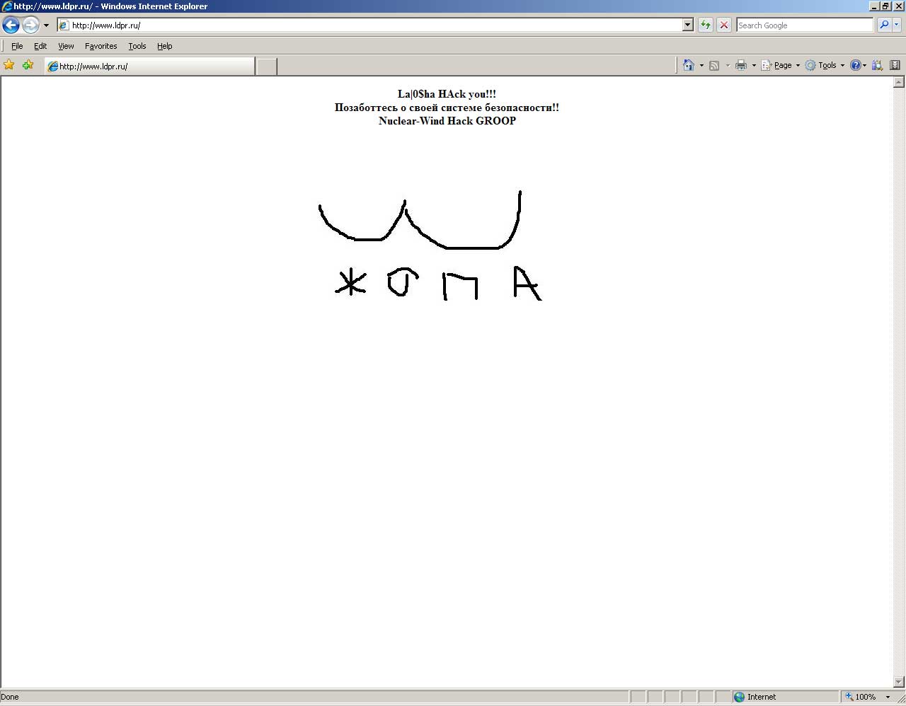 Сайт Либерально-демократической партии России (http://www.ldpr.ru/) подвергся дефейсу. По состоянию на 10:30 утра по московскому времени на его главной странице написано "La|0$ha HAck you!!!