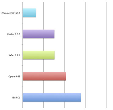 Результаты тестирования SunSpider были следующими (чем меньше показатель, тем лучшие): Chrome 2.0.159.0 -- 1275; Firefox 3.0.5 -- 3037; Safari 3.2.1 -- 3050; Opera 9.63 -- 4139; IE8 RC1 -- 5573. Однако для MS IE есть и положительные моменты, если сравнить производительность javascript в IE RC1 и предыдущей бета-версии, то в RC1 производительность улучшена на 70%.