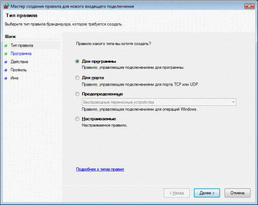 Управление в оснастке MMC “Повышенная безопасность” осуществляется с помощью мастера. При создании правила вы можете выбрать один из четырех типов: для программы, для порта, предопределенное или пользовательское. Пояснения см. на рис2.